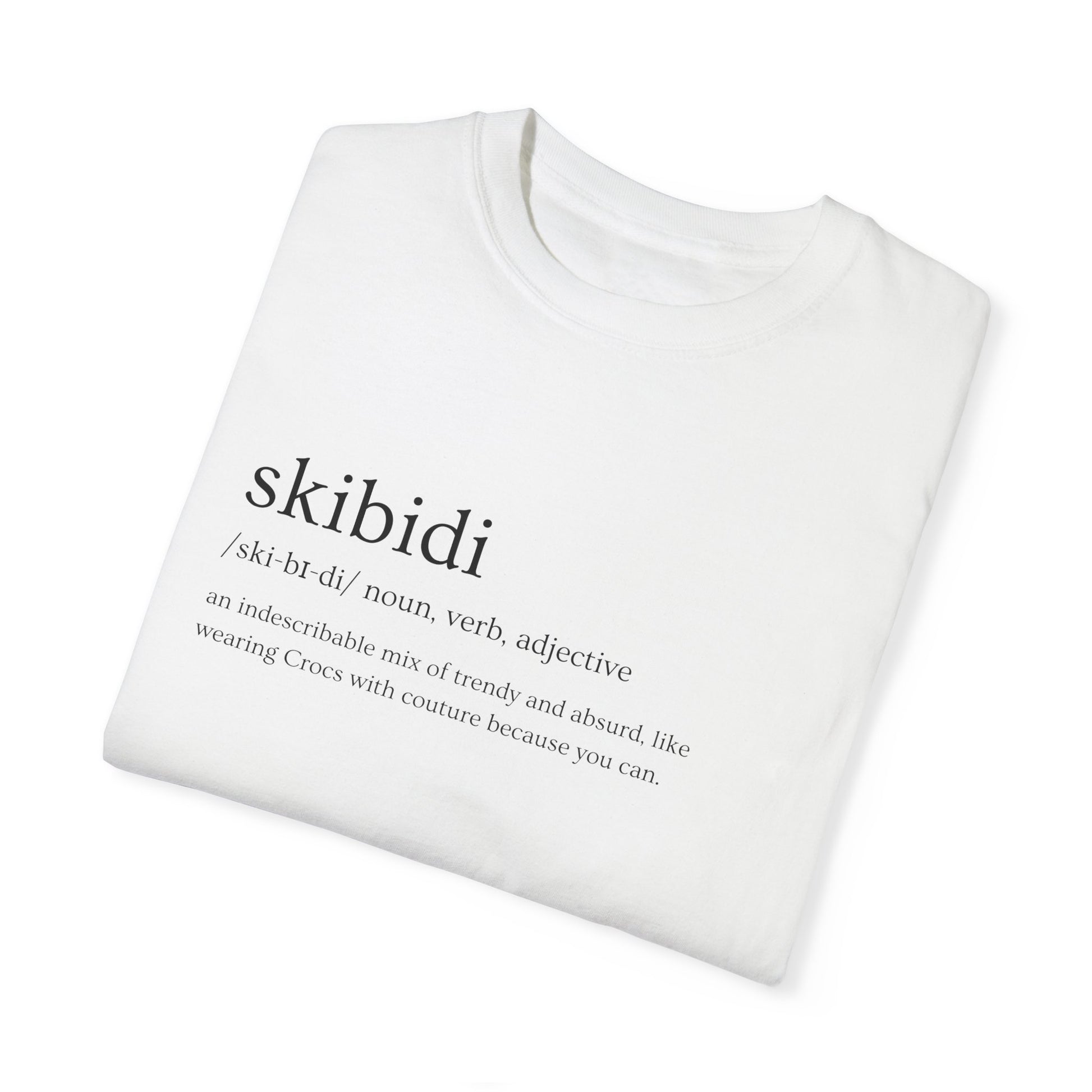 Skibidi isn’t just a word—it’s a whole vibe. This tee defines the perfect mix of trendy and absurd, like Crocs with couture (because why not?). Printed on the ultra-soft Comfort Colors 1717, it’s heavyweight, pre-shrunk, and built for effortless style.